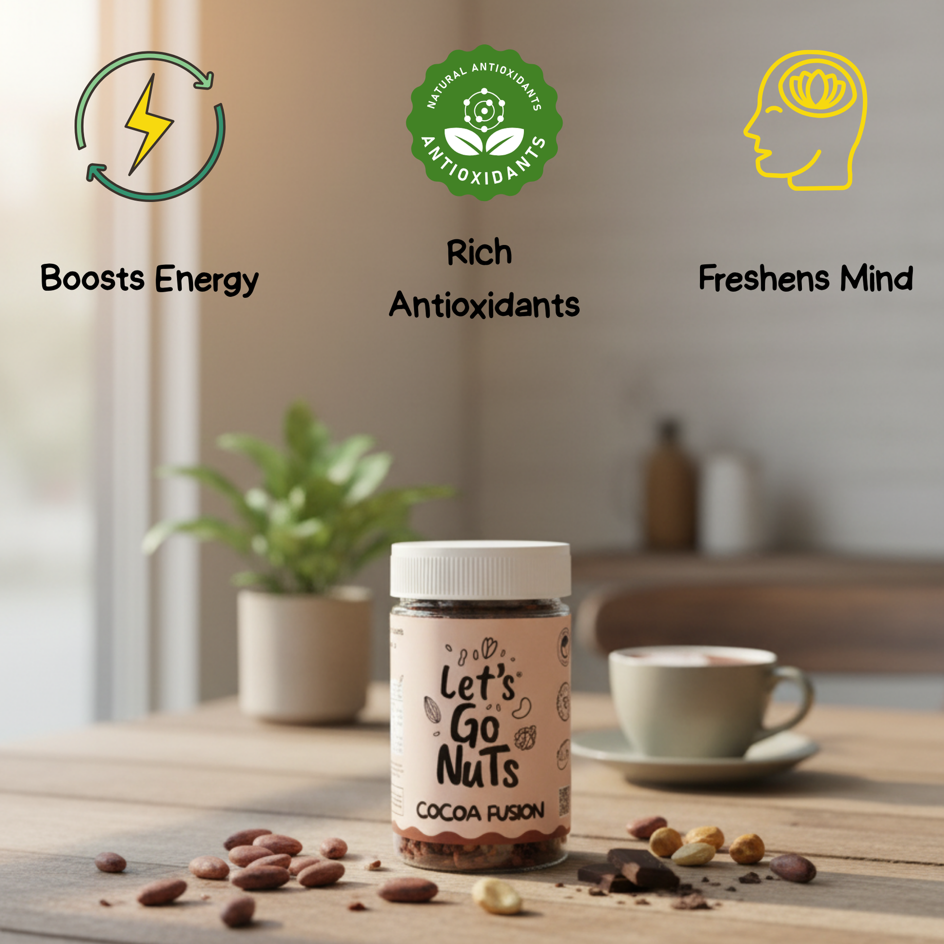 Cocoa Fusion is a concept-driven functional snack crafted for everyday energy. Made with almonds, seeds, dry fruits, and unsweetened cocoa, it satisfies chocolate cravings naturally without the calories or guilt of regular chocolate.