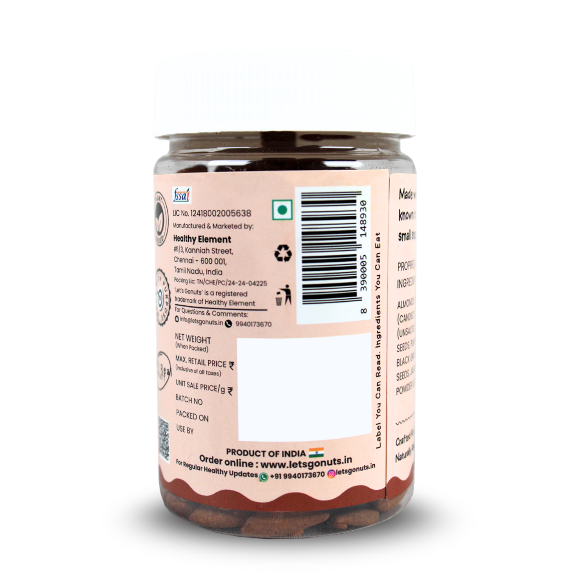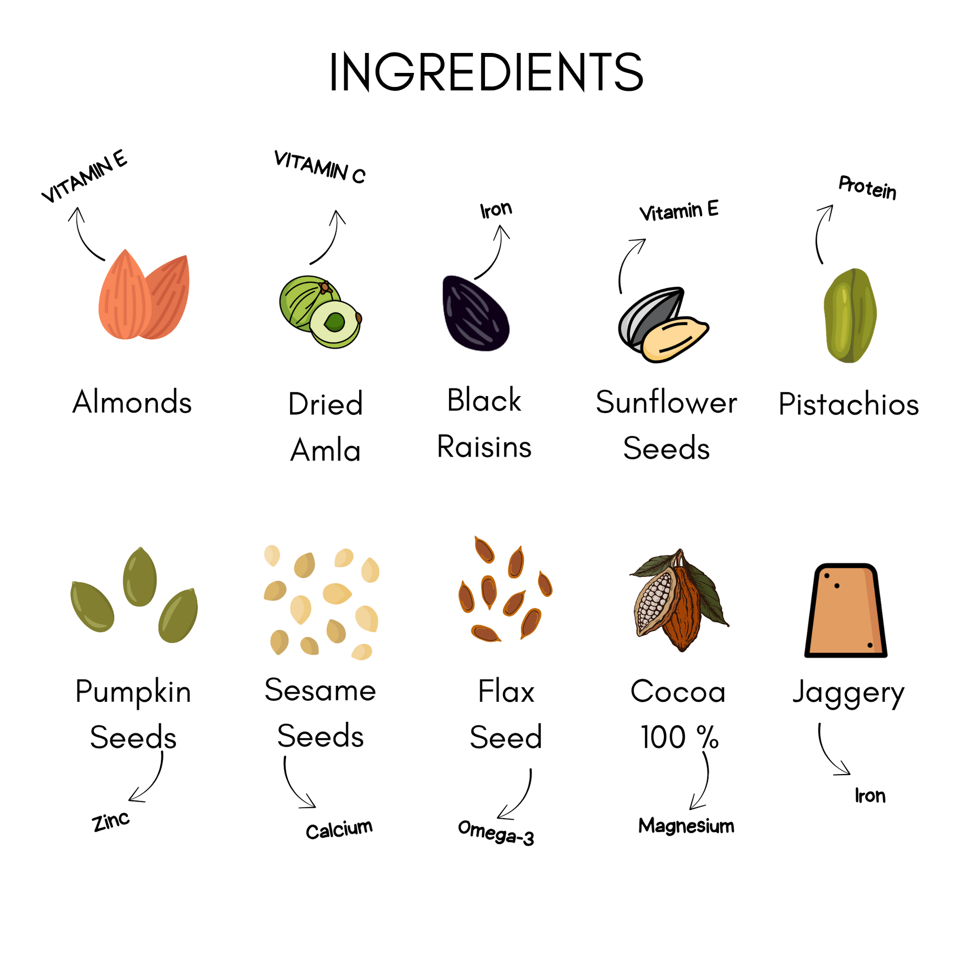 - Power-packed ingredients – Almonds, pumpkin seeds, sunflower seeds, pista, jaggery, awla & cocoa.