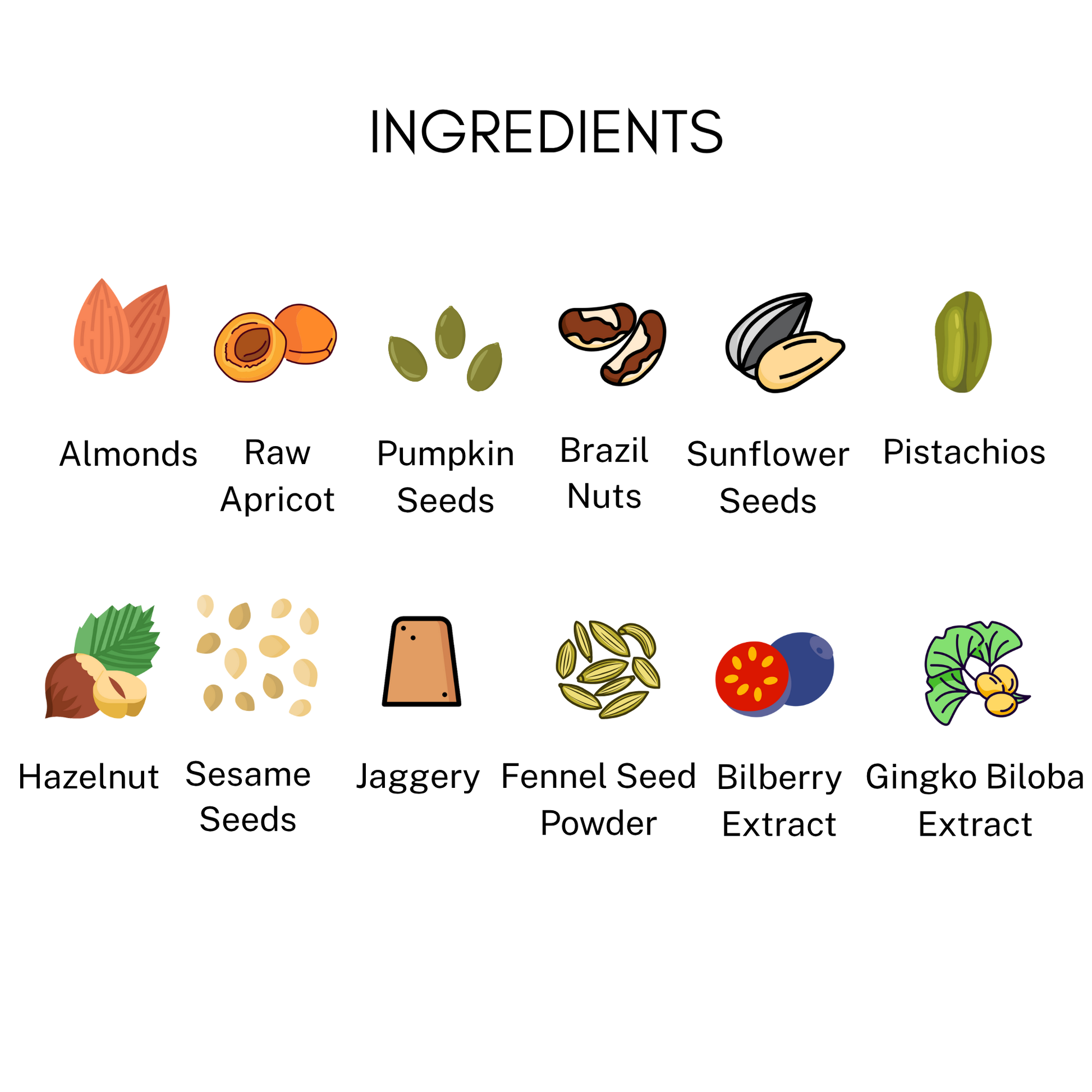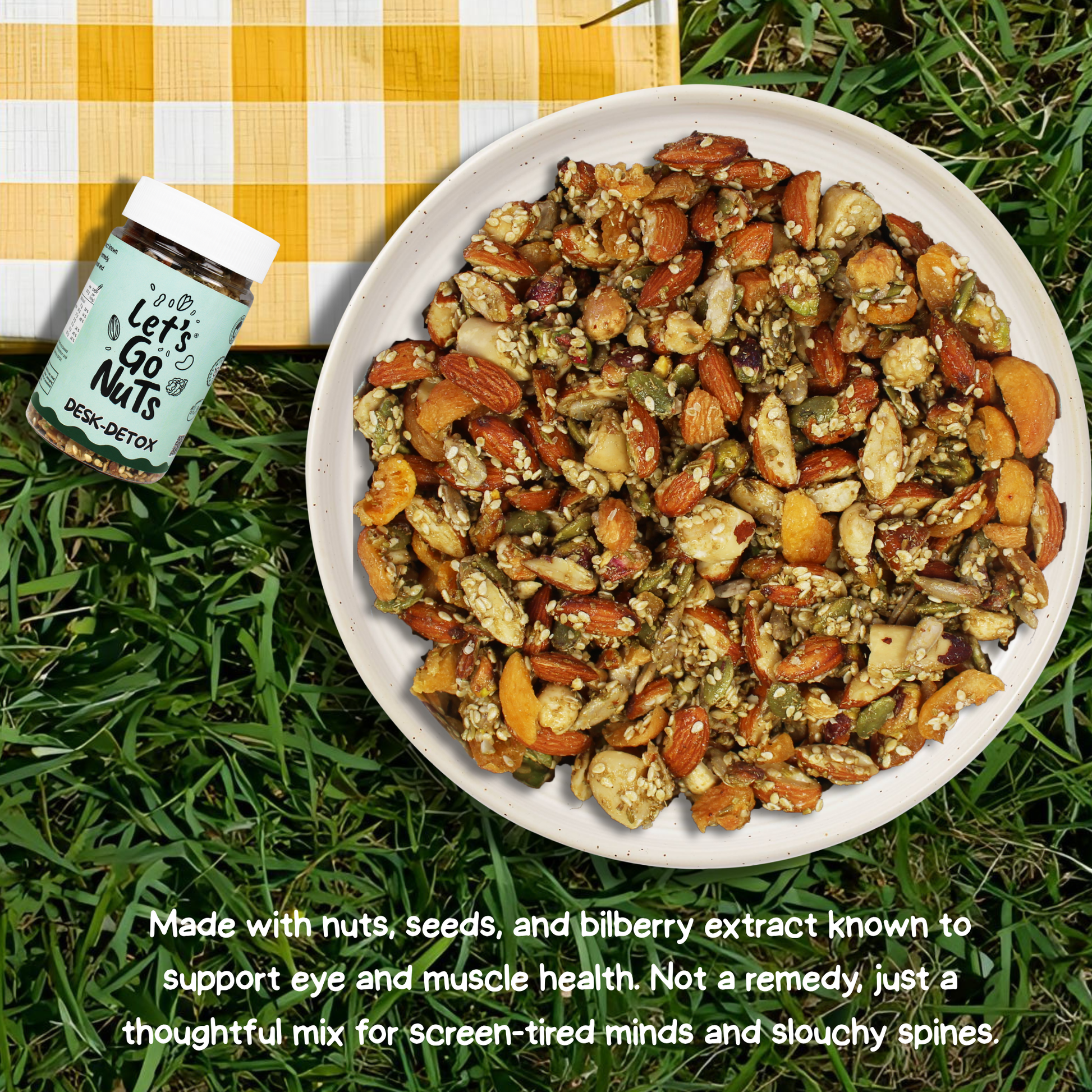 Desk Detox is a thoughtfully curated blend of nuts, seeds, and eye-support ingredients—designed for people who spend long hours on laptops, phones, and digital screens. This mix combines raw apricots and pistachios (rich in Vitamin A), selenium-packed Brazil nuts, and fennel-infused jaggery powder, finished with a subtle touch of bilberry and ginkgo extracts known for supporting vision wellness.