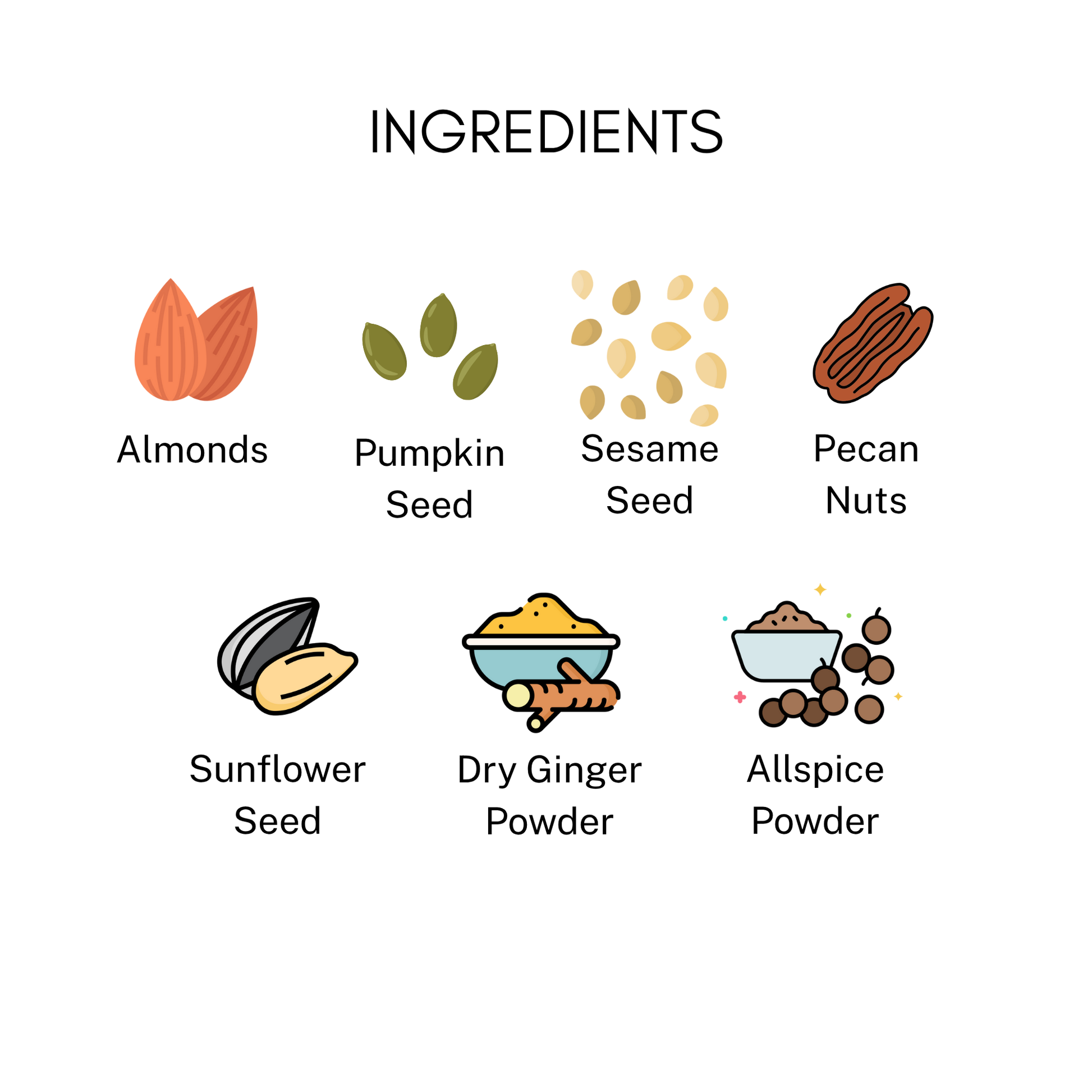- Powered by real ingredients – Almonds, pecans, sunflower seeds, pumpkin seeds & allspice.